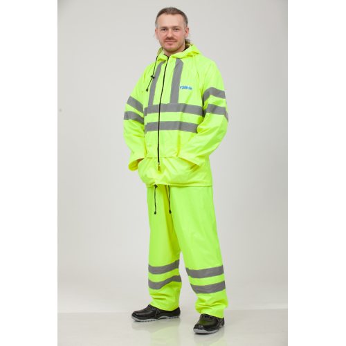 3. Ткань: костюм изготовлен из прочной плащевой ткани с ПВХ покрытием. Вес ткани — 225 гр./метр.кв. Водоупорность ткани не менее 5000 мм водяного столба. Ткань экологична и соответствует европейскому стандарту по содержанию вредных веществ EN 71 PART3.